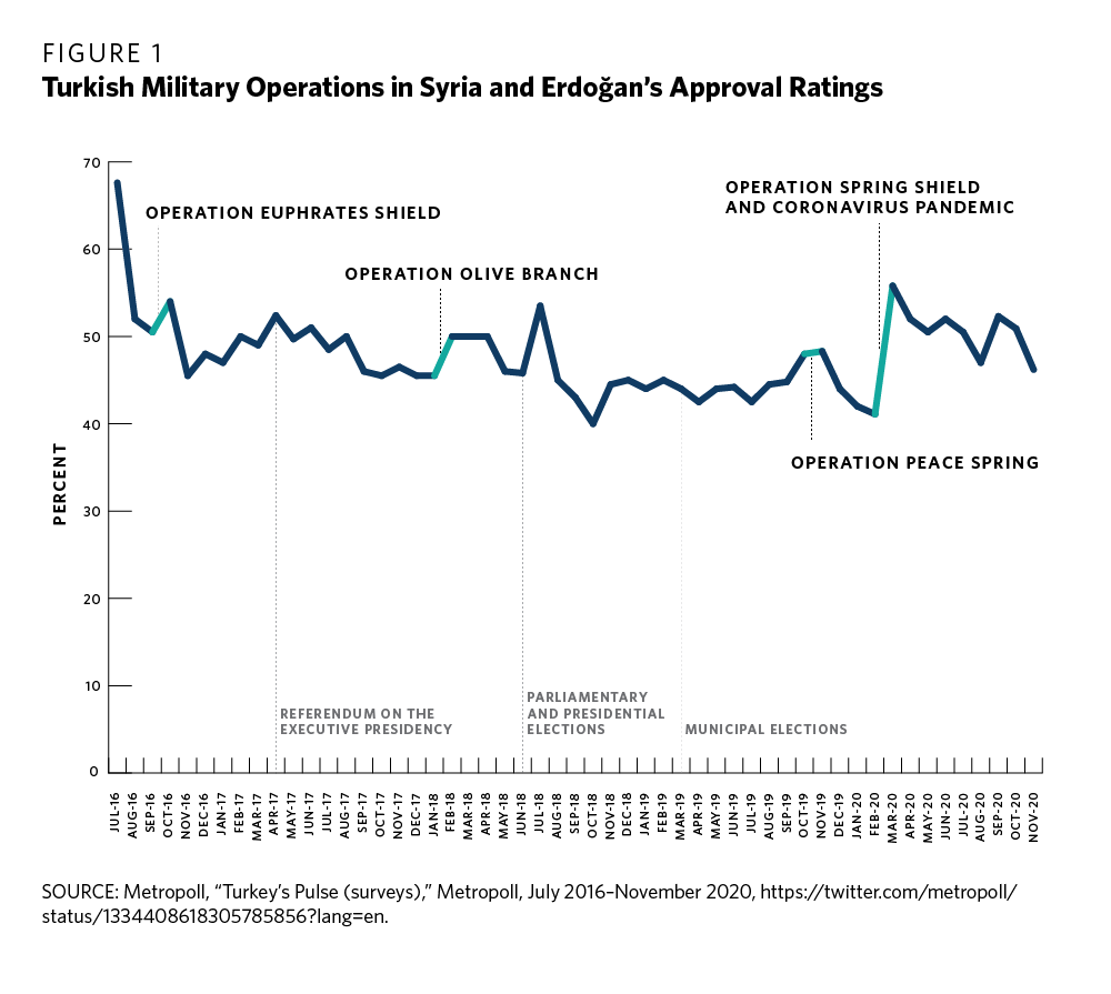 Turkey’s military operations in Syria have boosted the Turkish government’s increasingly nationalistic rhetoric and weakened its political opponents. Operations Euphrates Shield and Olive Branch were crucial to drumming up the support of nationalists in the lead-up to the April 2017 referendum and the June 2018 elections, respectively. Meanwhile, Operations Peace Spring in October 2019 and Spring Shield in February–March 2020 both followed historic drops in Erdoğan’s approval ratings (see figure 1).15