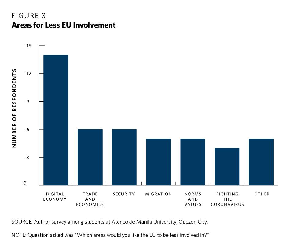 One challenge in the design of this report was to avoid generating Eurocentric questions that test European self-perceptions abroad, such as “Is the EU a trade power? Or a normative power? Or a global regulator? A model of regional integration?” To avoid confirmation bias, researchers investigated the issues through open-ended questions in seven fields: trade, security, values, climate, the digital economy, migration, and the coronavirus pandemic. They explored questions that compared Europe or the EU—which are often seen interchangeably by less specialized audiences—with other actors, such as the United States, China, and Russia as well as individual European states, including former colonial powers. The researchers investigated general and historical perceptions of Europe by engaging with a variety of interlocutors—government officials, opposition figures, societal groups, business leaders, academics, students, and local community leaders—who were also asked about what they would like to see from the EU.